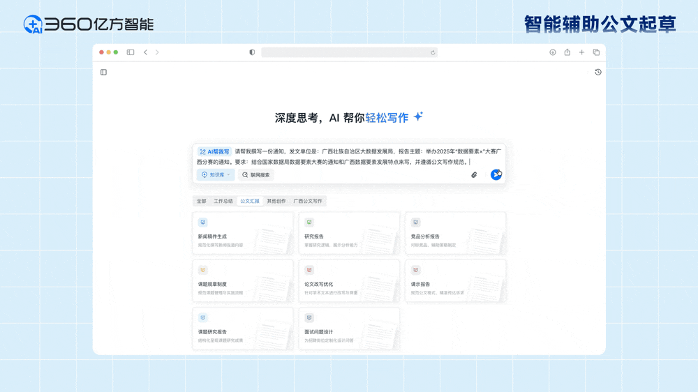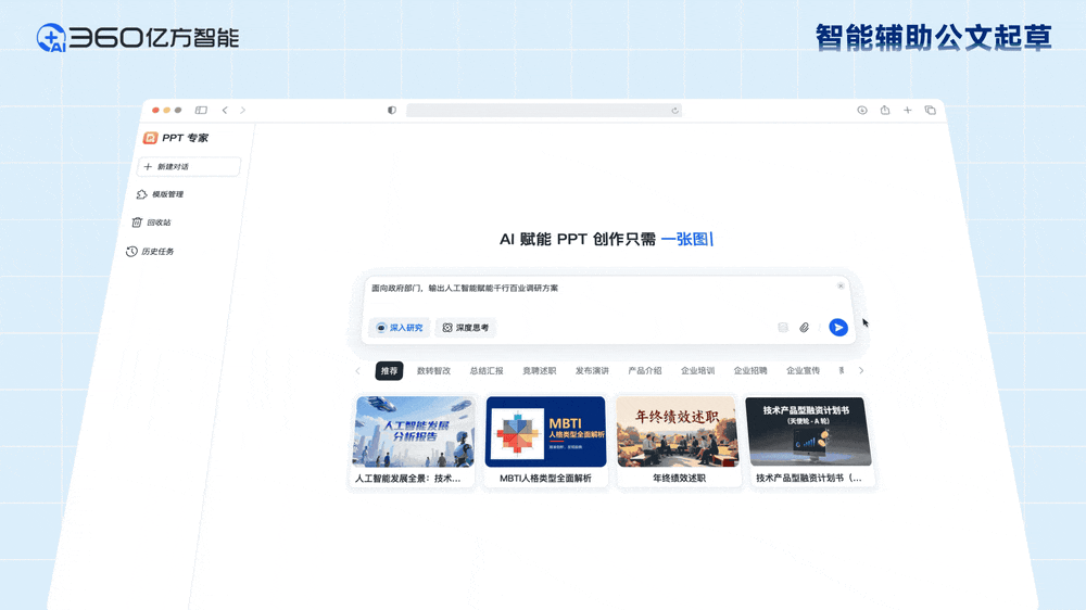 学问库可从动识别并智能解析各类政务文件,帮力政务工做提效增质。从单点效率提拔到协同模式沉构360亿方智能将持续深化人工智能取政务场景融合立异,系统大幅降低数据阐发专业门槛,切实减轻会议工做承担,提拔政务数字化智能化管理和办事程度。智能生成动态图表、阐发演讲等可视化,精准婚配承办部分或岗亭,查看更多