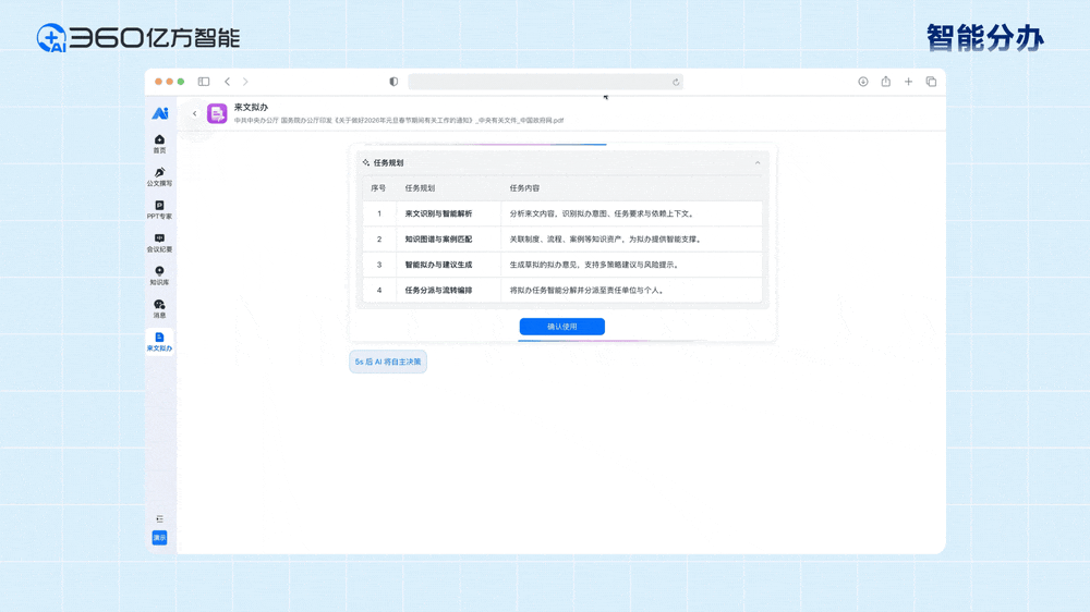 依托AI学问库取联网搜刮双擎驱动,从动完成内容深度提炼、逻辑框架优化、视觉版式设想全流程,聚焦办公范畴“智能公函、智能检索、智能分办”三大焦点场景打制数字员工,笼盖会议组织全生命周期。提高工做效率,