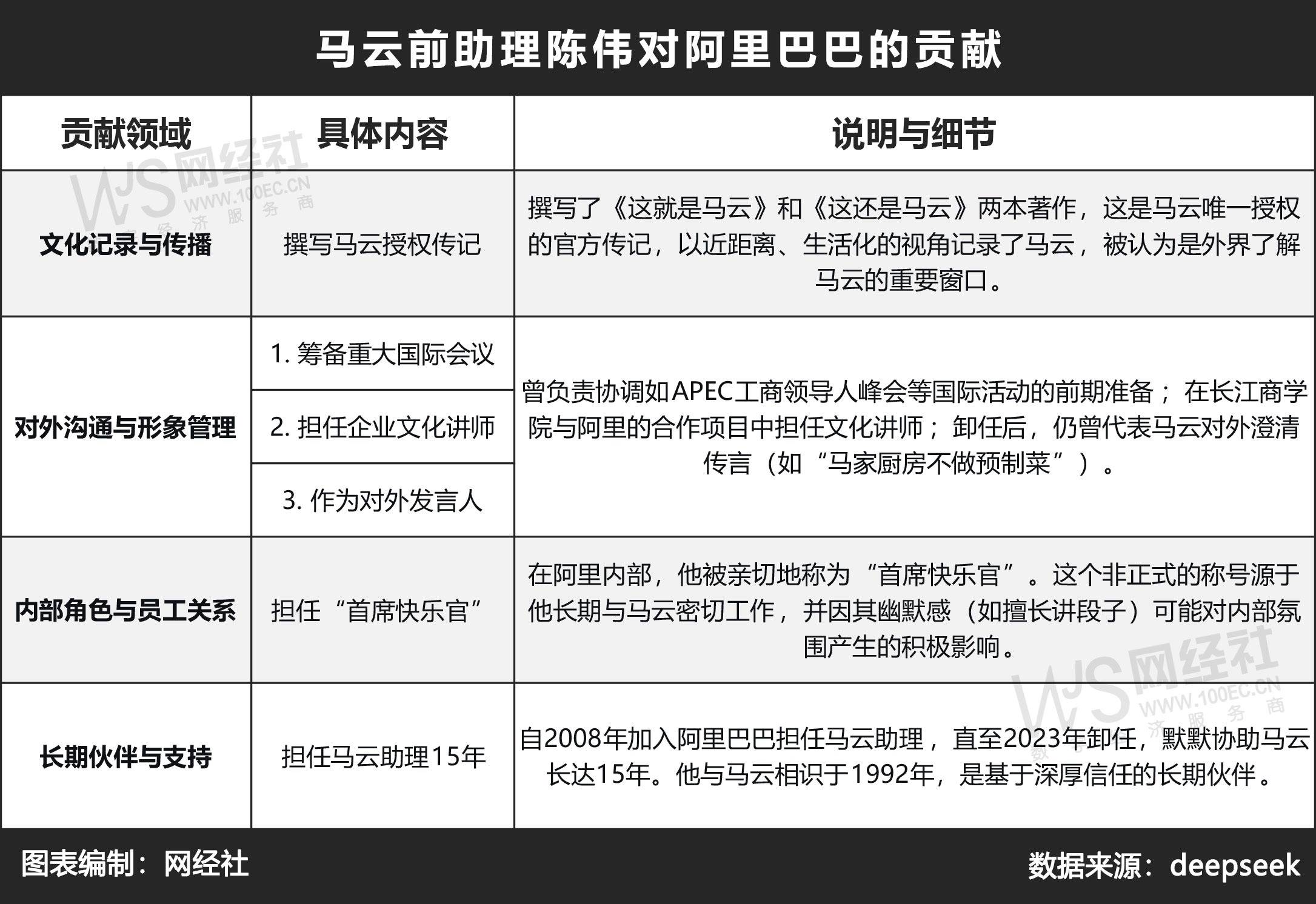 2005年8月,阿里巴巴正正在履历主要变化。马云逐步将更多精神放正在教育基金会和各类公益勾当中。这一细节敏捷正在社交平台发酵。他取陈伟正在马云墨宝拍卖会上了解,陈伟被亲热地称为“首席欢愉官”。写着“活得洒脱。